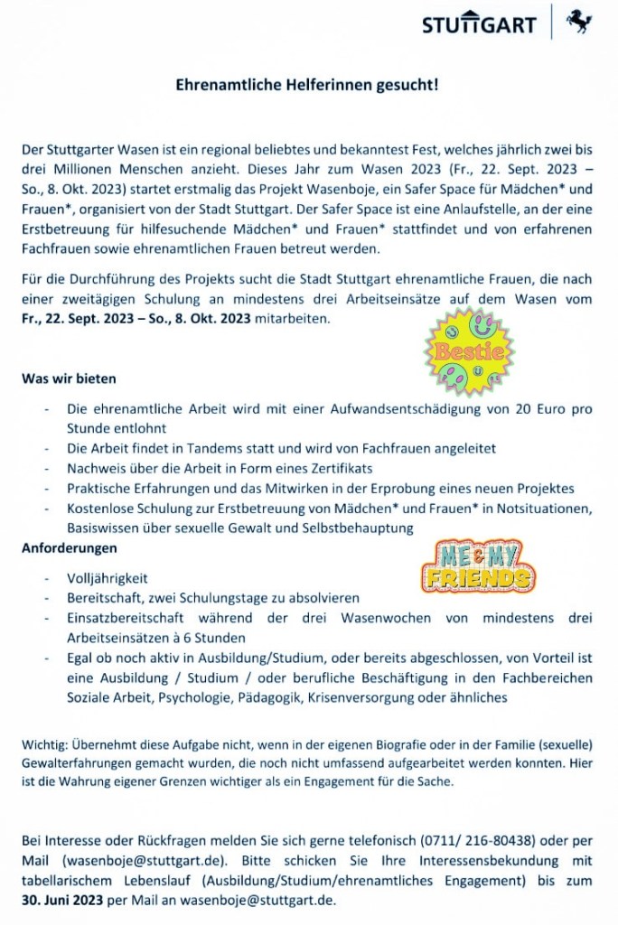 Der Stuttgarter Wasen ist ein regional beliebtes und bekanntest Fest, welches jährlich zwei bis drei Millionen Menschen anzieht. Dieses Jahr zum Wasen 2023 (Fr., 22. Sept. 2023 – So., 8. Okt. 2023) startet erstmalig das Projekt Wasenboje, ein Safer Space für Mädchen* und Frauen*, organisiert von der Stadt Stuttgart. Der Safer Space ist eine Anlaufstelle, an der eine Erstbetreuung für hilfesuchende Mädchen* und Frauen* stattfindet und von erfahrenen Fachfrauen sowie ehrenamtlichen Frauen betreut werden. Für die Durchführung des Projekts sucht die Stadt Stuttgart ehrenamtliche und hauptamtliche Frauen, die nach einer zweitägigen Schulung an mindestens drei Arbeitseinsätze auf dem Wasen vom Fr., 22. Sept. 2023 – So., 8. Okt. 2023mitarbeiten.