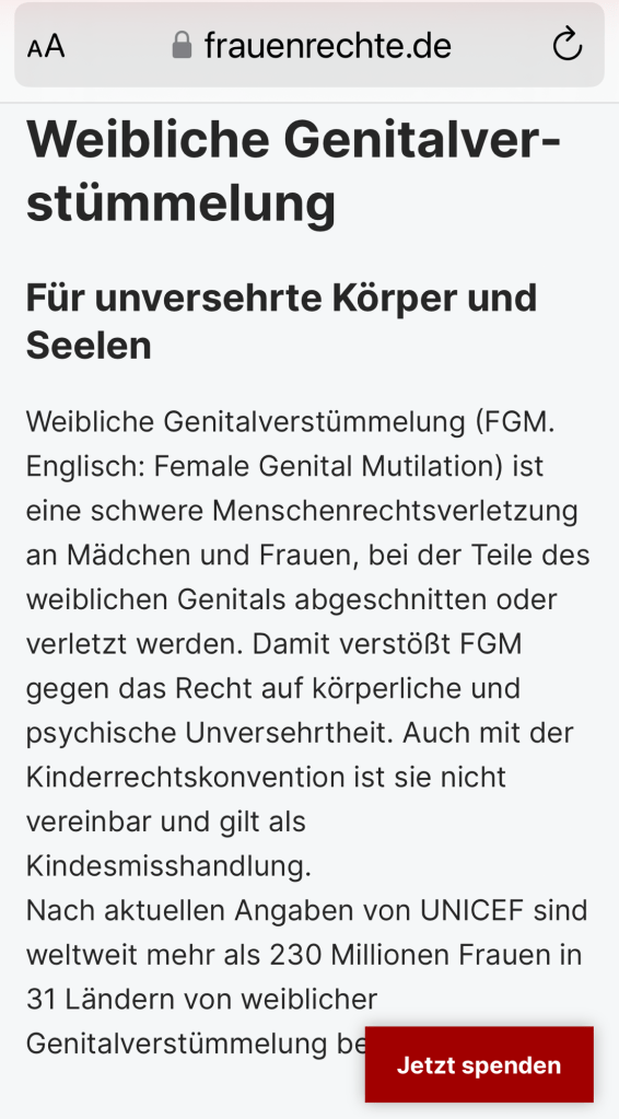 Da fällt mir der schon lange existierende Frauenrechtsverein Terre de Femme ein, auch ein Mitglied des Bundesverbands Nordisches Modell, der sich schon seit Jahrzehnten (seit 40 Jahren) gegen diese Genitalverstümmelung einsetzt und Frauen aus Afrika unterstützt und beisteht, die aus dieser unsäglichen Situation raus wollen.