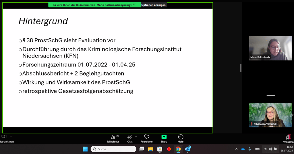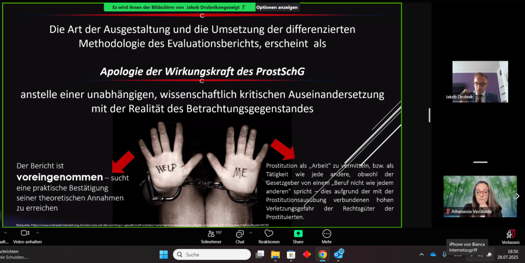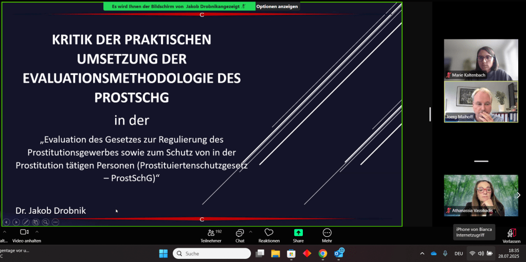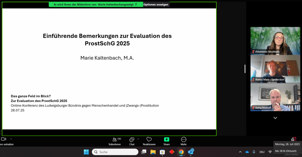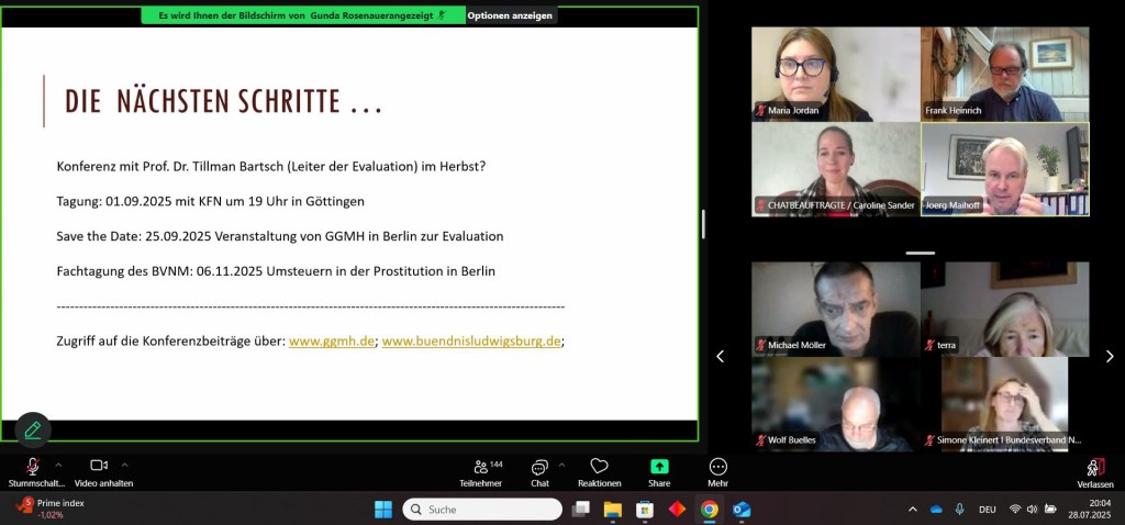 Am Montag, den 28.07.2025 fand um 18 Uhr Deutsche Zeit, die Bundesweite Onlinekonferenz statt. Das Thema war der aktuell herausgebrachte Bericht zur Evaluierung des Prostituiertenschutzgesetzes.