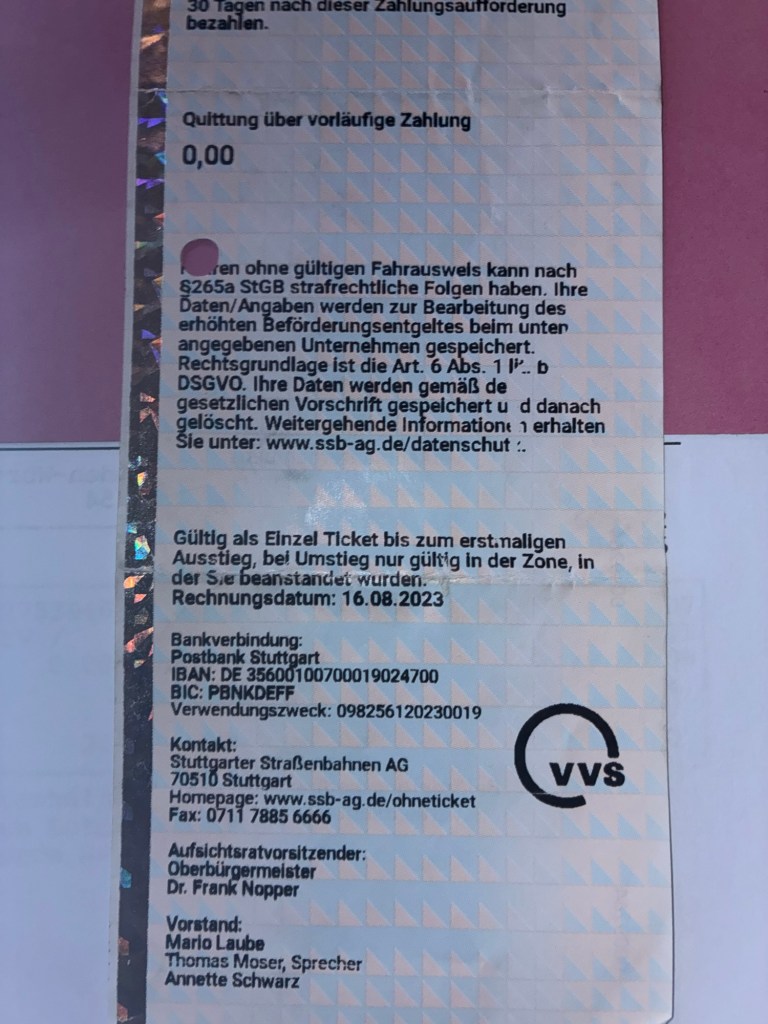 So füllte ich nun einen Zettel mit meiner Anschrift aus, und bekam einen Strafzettel mit 60 Euro Busgeld.