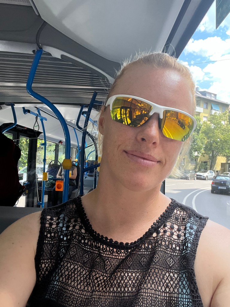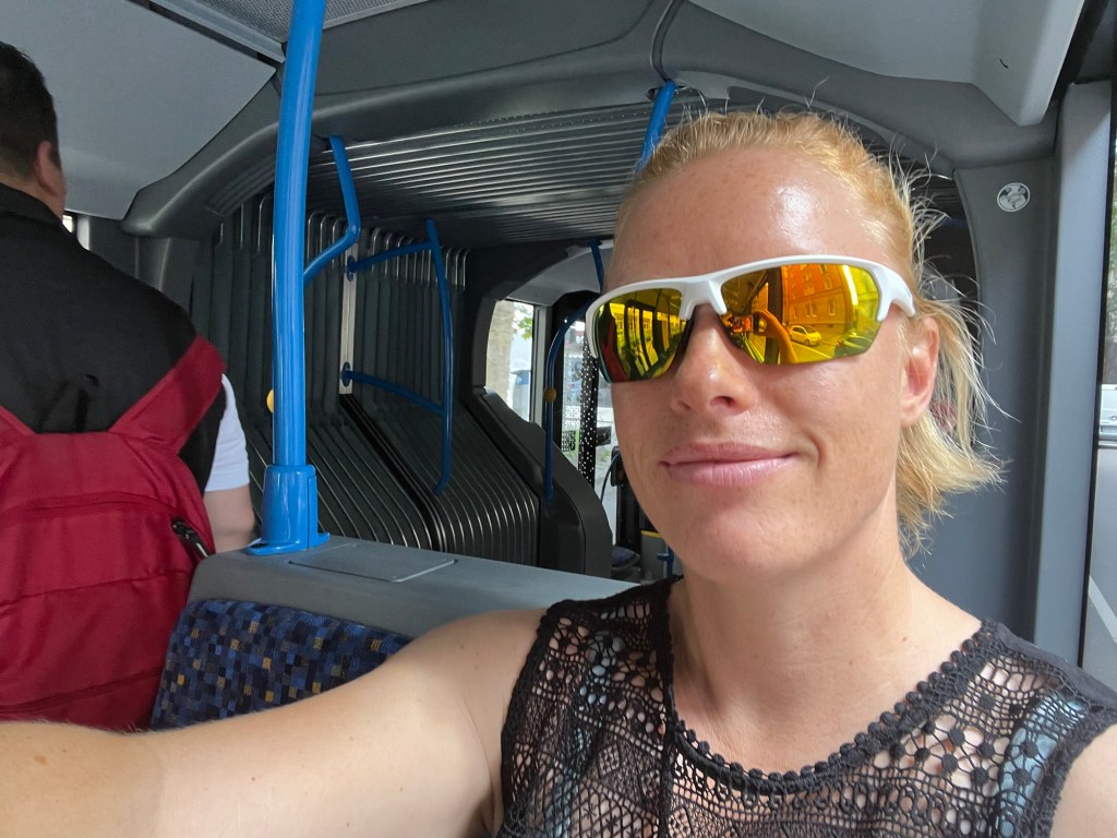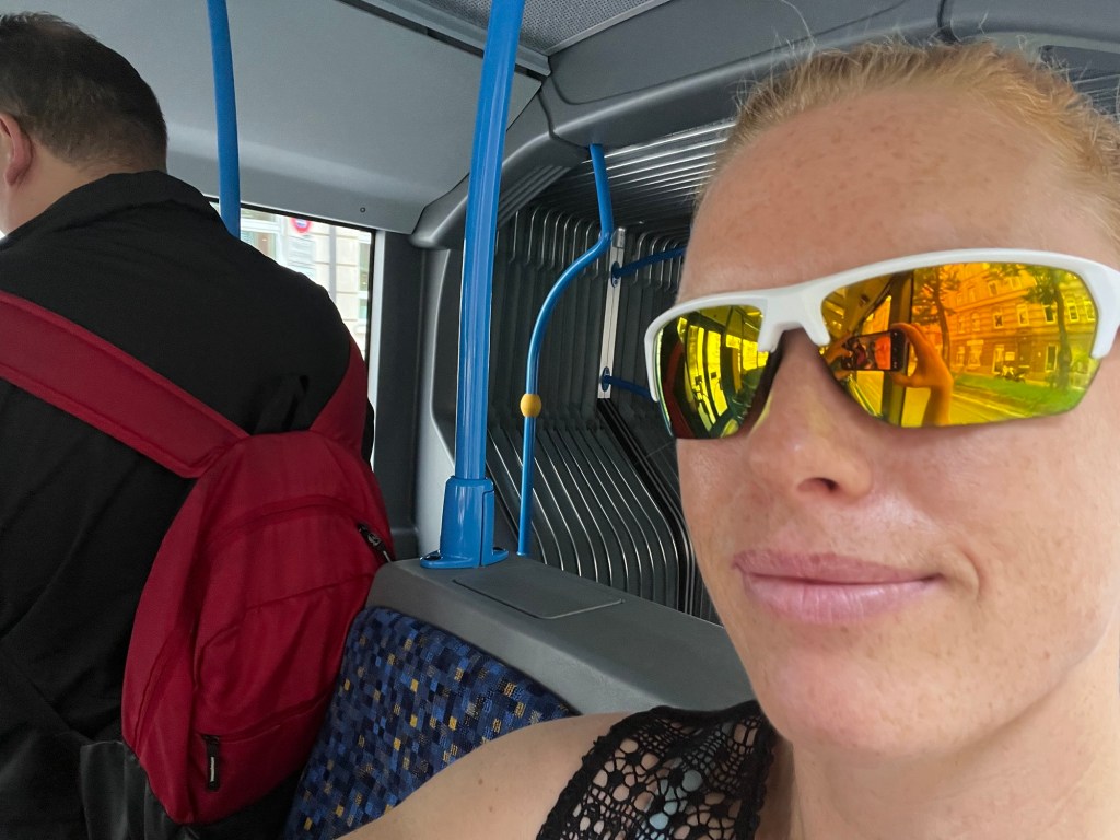 Der Polizist schaute mich verwundert an und meinte, dass er eine Dame suche, die laut den Informationen, die er bekam, hier im Bus durchdrehen würde.