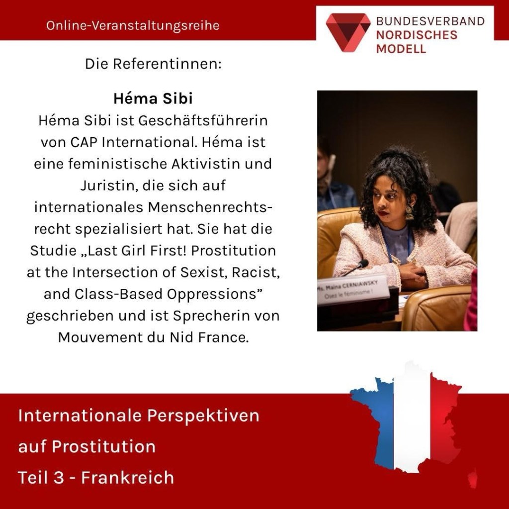 Frau Sibi ist Geschäftsführerin von CAP International. Héma ist eine feministische Aktivistin und Juristin, die sich auf internationales Menschenrechtsrecht spezialisiert hat. Sie hat die Studie „Last Girl First! Prostitution at the Intersection of Sexist, Racist, and Class-Based Oppressions“ geschrieben und ist Sprecherin von Mouvement du Nid France.