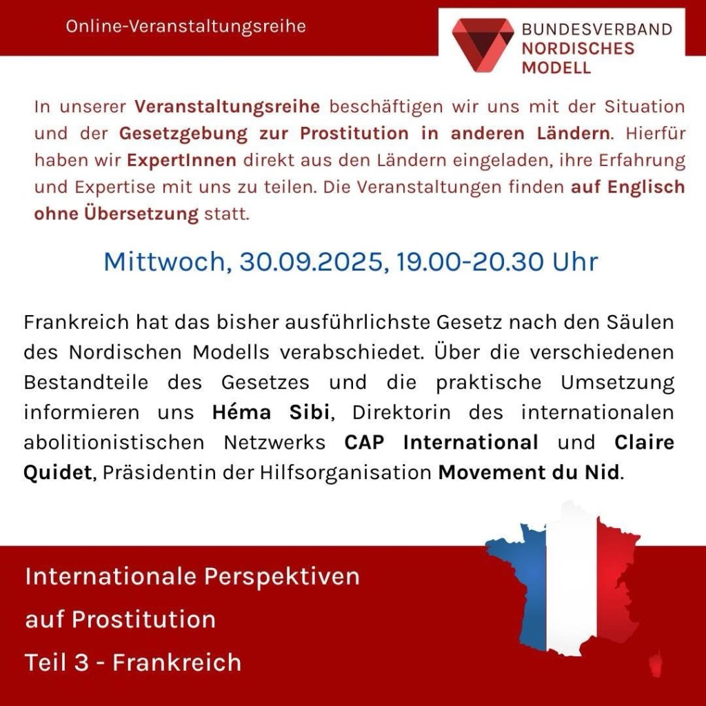 Zitat: In unserer Veranstaltungsreihe beschäftigen wir uns mit der Situation und der Gesetzgebung zur Prostitution in anderen Ländern. Hierfür haben wir Expertinnen direkt aus den Ländern eingeladen, ihre Erfahrung und Expertise mit uns zu teilen. Die Veranstaltungen finden auf Englisch ohne Übersetzung statt.
