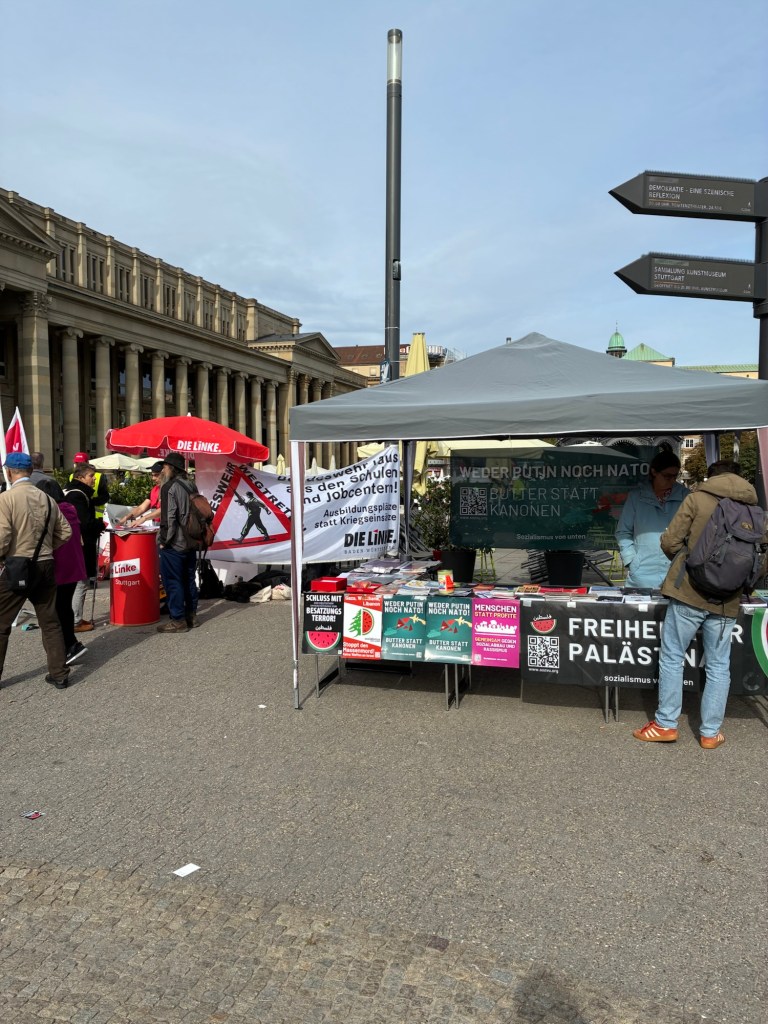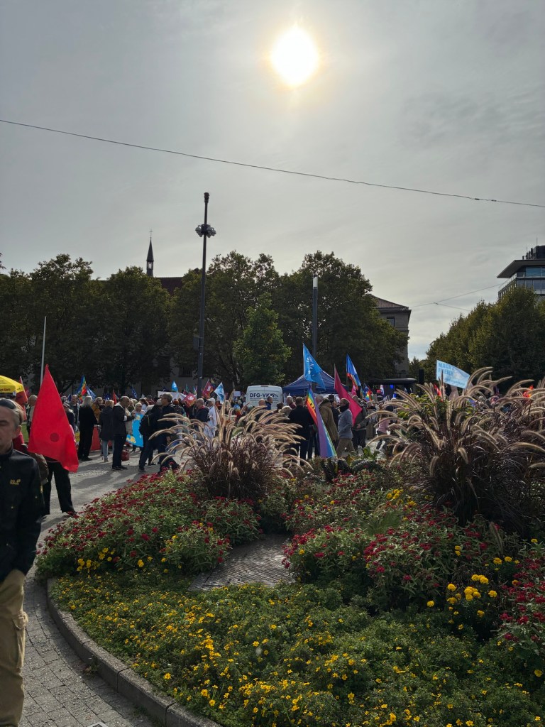 Vorbei an einer großen Demonstration gegen Waffenlieferungen, Krieg, Wehrpflicht